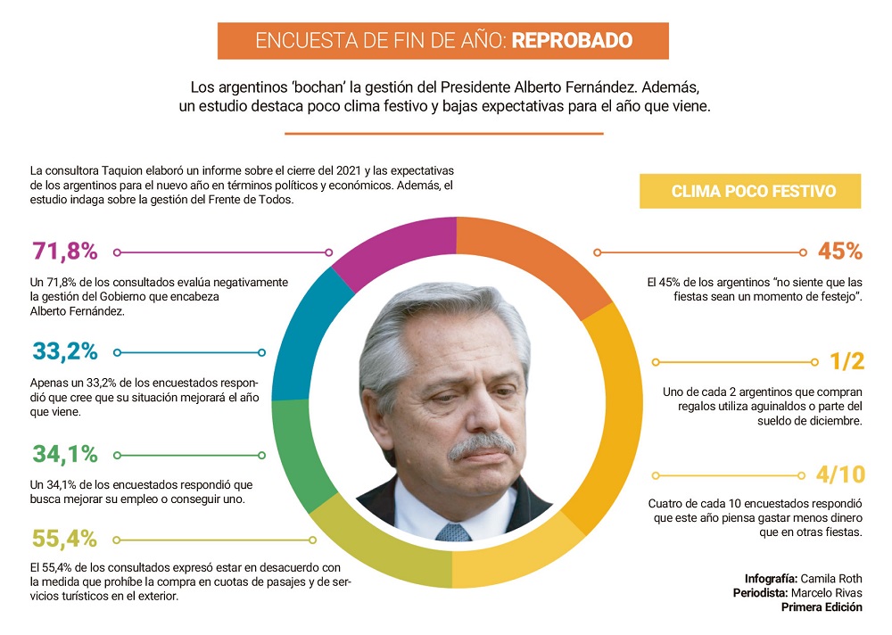 La consultora Taquion elaboró un informe sobre el cierre del 2021 y las expectativas de los argentinos para el nuevo año en términos políticos y económicos. Además, el estudio indaga sobre la gestión del Frente de Todos y del presidente Alberto Fernández. Estos son los resultados: