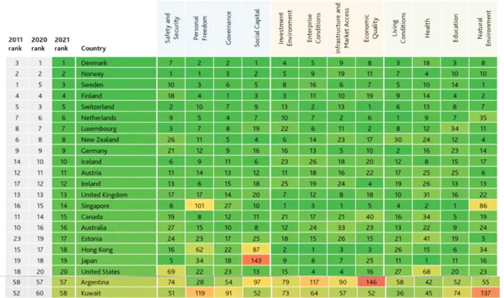 Las cinco naciones más “prósperas” del mundo en 2021 fueron Dinamarca, Noruega, Suecia, Finlandia y Suiza. Esto es, 4 de los 5 primeros lugares del ranking fueron ocupados por países escandinavos. En las posiciones sexta a décima siguen Holanda, Luxemburgo, Nueva Zelanda, Alemania e Islandia.