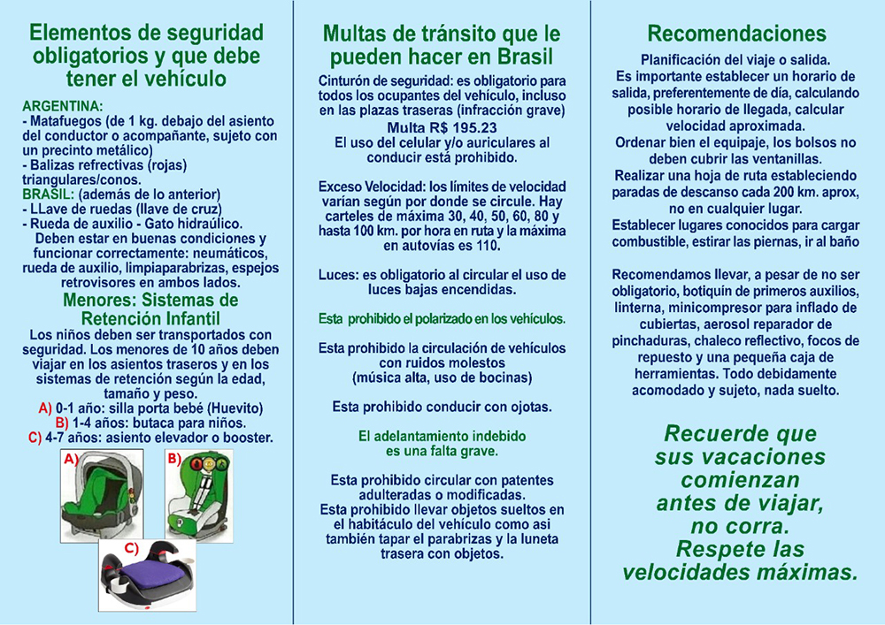 En la misma línea, desde el Consejo Provincial de Seguridad Vial emitieron un flyer con más recomendaciones a tener en cuenta para los viajes a Brasil. “Es un trabajo que hacemos todos los años, y desde el Consejo tratamos de dar la mayor cantidad de información posible, también tiene los teléfonos del consulado argentino en Brasil por cualquier eventualidad, así como consejos útiles“.
