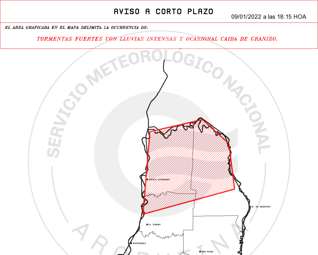El Servicio Meteorológico Nacional (SMN) emitió un nuevo “aviso a muy corto plazo” para tres departamentos de Misiones, ante la posibilidad de que se registren “tormentas fuertes con lluvias intensas y ocasional caída de granizo”.