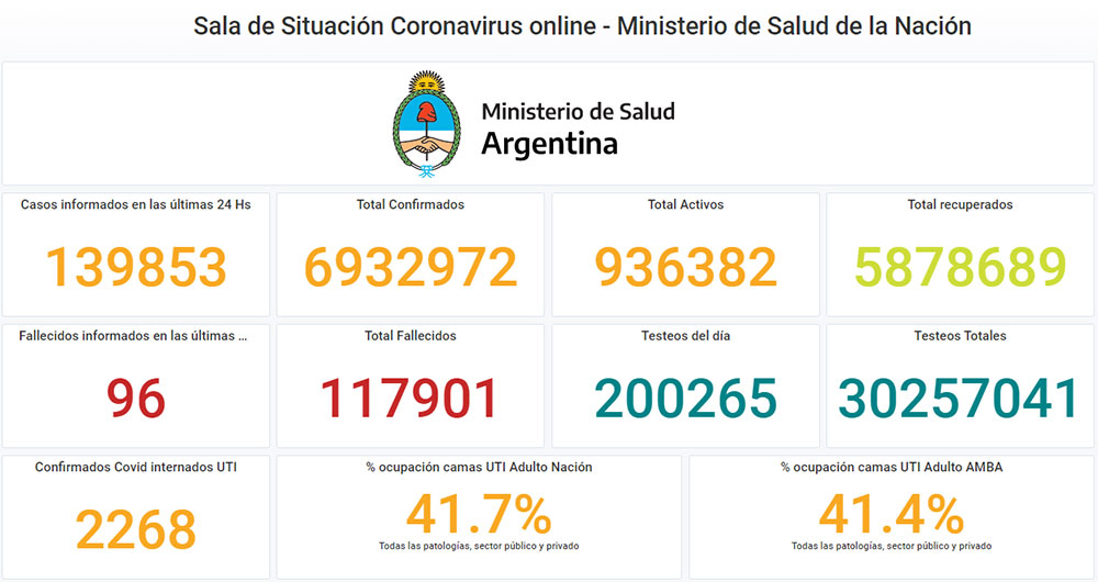 Con estas cifras, el total acumulado desde el inicio de la pandemia en el país asciende a 6.932.972 personas,  de las cuales 117.901 fallecieron y 5.878.689 se recuperaron, mientras que 936.382 continúan con el virus activo.