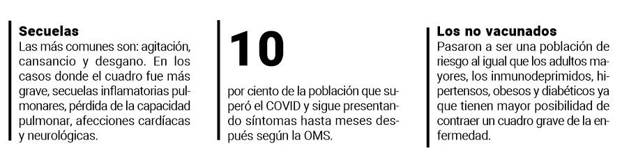 Es decir, las consultas por secuelas se fueron aplacando y mermando, mientras iba creciendo el porcentaje de población vacunada. Es por eso que, según Loizaga, “los no vacunados pasaron a ser un grupo de riesgo, igual que la gente mayor, los inmunodeprimidos, hipertensos, obesos y diabéticos” ya que tienen más riesgo de contraer un cuadro grave del virus.