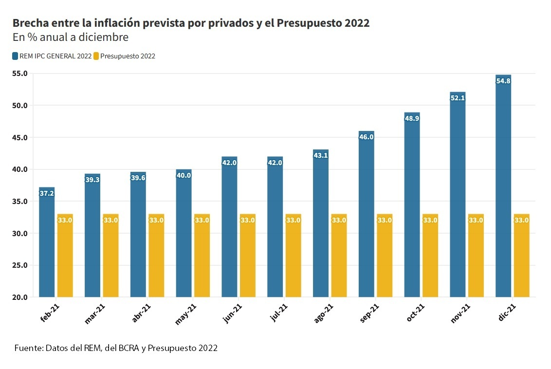En el último Relevamiento de Expectativas de Mercado (REM) del Banco Central, entre el 27 y 30 de diciembre de 2021, los analistas de mercado proyectaron que la inflación minorista para 2022 se ubicará en 54,8% (2,7 puntos porcentuales superior a la encuesta previa).