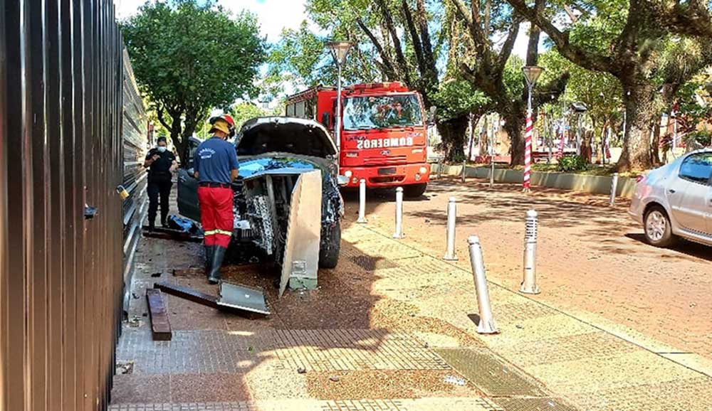 Esta tarde, por causas que se investigan, en el centro Cívico de Oberá, un vehículo Peugeot 308, guiado por un hombre de 30 años, despistó e impactó contra paneles eléctricos, postes y un banco.
