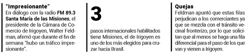 En diálogo con la radio FM 89.3 Santa María de las Misiones, el presidente de la Cámara de Comercio de Irigoyen, Walter Feldman, afirmó que durante el fin de semana “hubo un tráfico impresionante” y detalló que “desde temprano se podían ver las largas filas en la Aduana”.