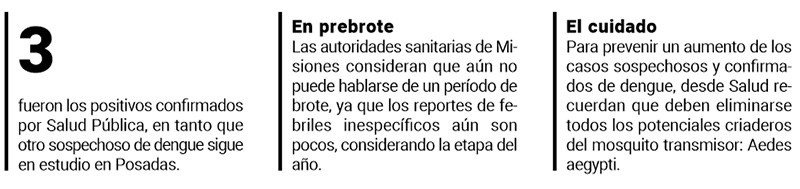 En materia de confirmaciones aclaró que de estos reportes “alrededor de 36 fueron desestimadas y hubo tres positivos nuevos”. Sobre estos casos, Silva aclaró que “hablamos de DEN 1, registrados en los primeros días de enero y ahora hay otro en estudio”. En cuanto al seguimiento sanitario, aclaró que “los positivos se registraron en Posadas y las notificaciones de Garupá hasta ahora fueron desestimadas”.