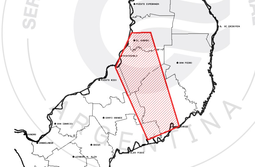 En este caso, el “aviso a muy corto plazo” rige hasta las 19:30 en los departamentos 25 de Mayo, Cainguás, Guaraní, Eldorado, Libertador San Martin y Montecarlo.