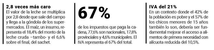 El maíz, un insumo, representa el 18,4% del monto de la leche cruda –tambo- y el 6,6% sobre el final, del sachet. De los impuestos que paga la cadena, 77,6% son nacionales, 17,8% provinciales y 4,6% municipales. El IVA representa el 67% de todos los impuestos.