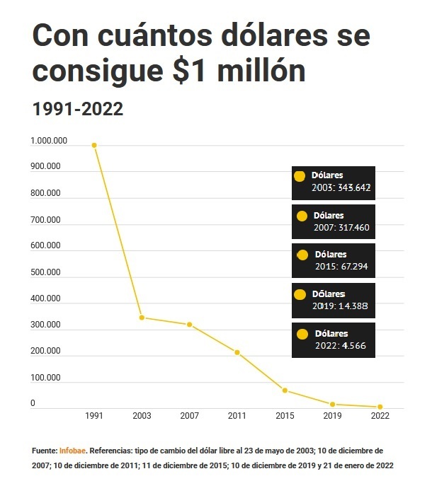 En ese marco, Infobae hizo un relevamiento para dar cuenta de cuántos dólares representan un millón de pesos hoy, y cómo fue cambiando esa dinámica desde la convertibilidad pasando por distintas fechas de asunción presidencial desde 2003 cuando llega a la presidencia Néstor Kirchner.