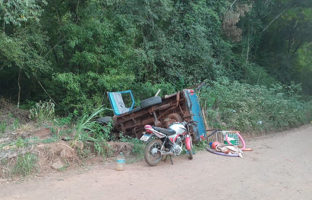 Un insólito incidente vial se registro el domingo por la tarde en un camino terrado del acceso a Paraje X de Campo Ramón, donde se produjo un despiste en cadena de una motocicleta de 125 cc y de una camioneta Chevrolet.