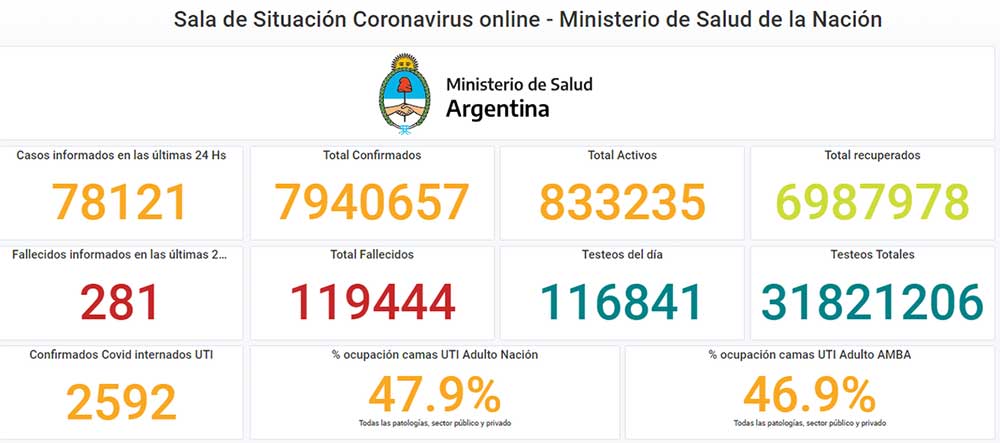 El Ministerio de Salud de la Nación informó hoy que en las últimas 24 horas se registraron 78.121 contagios de coronavirus, mientras que aumentó significativamente la cantidad de decesos a causa de la enfermedad, 281, la cantidad más alta en 160 días.  La última vez que se registró un número mayor fue el 17 de agosto de 2021, con 300 fallecidos.