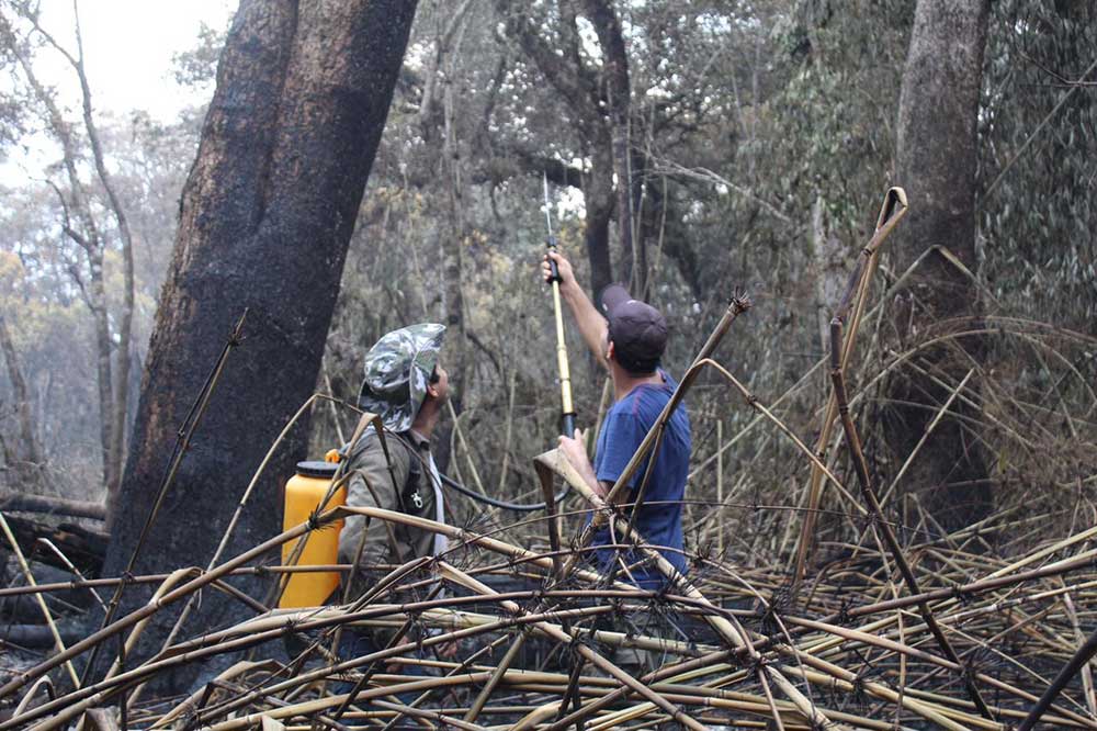 Respecto a los equipos abocados a apagar el fuego en la Reserva Guaraní, explicó que trabajan “en conjunto con una Brigada del Ministerio de Ecología que son parte de la Unidad de Manejo Integral de Biosfera Yabotí, con guardaparques del Parque Araucarias, con bomberos de San Pedro, con la Brigada Forestal. Teníamos 30 brigadistas que íbamos reemplazando. Hoy (por ayer) tenemos 20 que van a hacer este trabajo de tres días que vamos relevando porque son distancias muy largas y el personal se cansa mucho. Es un despliegue muy importante para controlar esto. No habíamos podido establecer los límites de hasta dónde podíamos detener el fuego y pudimos gracias al esfuerzo y trabajo coordinado con el avión hidrante del Plan de Manejo, que nos hizo cuatro descargas cuando el fuego se iba a las copas de los árboles para controlarlo. También estuvo el helicóptero de la provincia”.