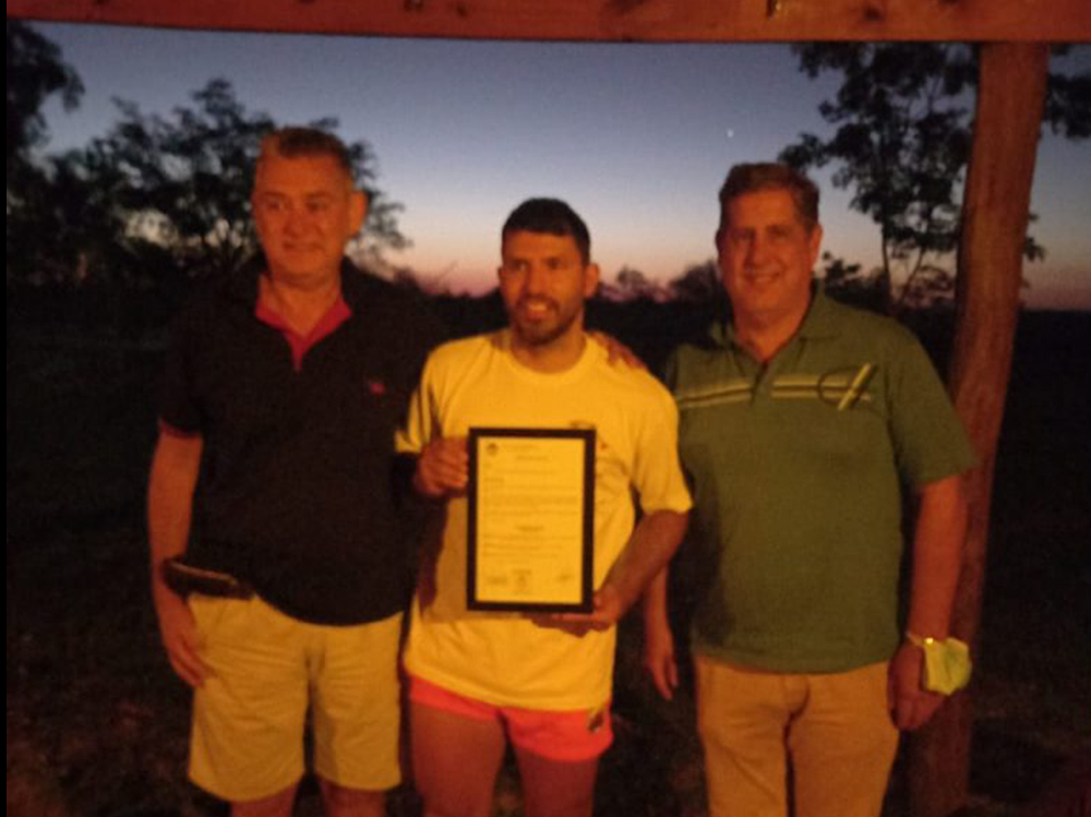 El viernes por la tarde, el intendente local, Hugo Benítez, junto al secretario de Turismo de la Municipalidad, Orlando Ribot entregaron al ex jugador de la Selección nacional una resolución que lo nombra Huésped de Honor de la Ciudad de Esquina, Corrientes, en la cabaña Río Lodge, donde esta alojado.