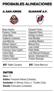 De no mediar inconvenientes de último momento, Guaraní alistará a Eduardo Flores; Alejandro Pérez, Rodrigo Lechner, Ariel Morales y Jonatan Medina; Manuel Roa, Juan Ardetti, Pablo Motta y Juan Manuel Rodríguez; Ignacio Valsangácomo y Cristian Barinaga.