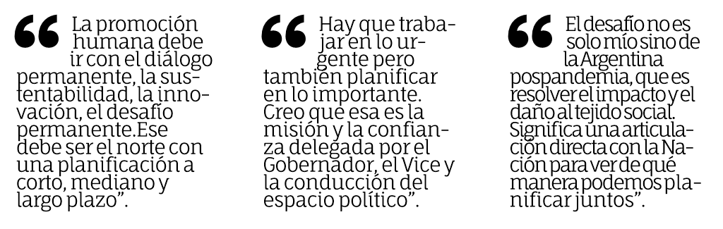 Sabe que el área social es sensible para cualquier gestión política y que muchas miradas (propias de la renovación como externas) se posarán en sus movimientos a partir de ahora. Preguntado si siente presión por la situación, sostuvo que: “Hay que devolver con trabajo la confianza depositada. La primera mirada es la mía misma y sentir el acompañamiento de la familia en esta instancia. Estamos al tanto del desafío y debemos correr el vedetismo y ponernos rápidamente en la tarea. No siento la presión de ninguna mirada y sí la responsabilidad de poder dar lo mejor en todo momento, sobre todo porque es la misión en este momento”.