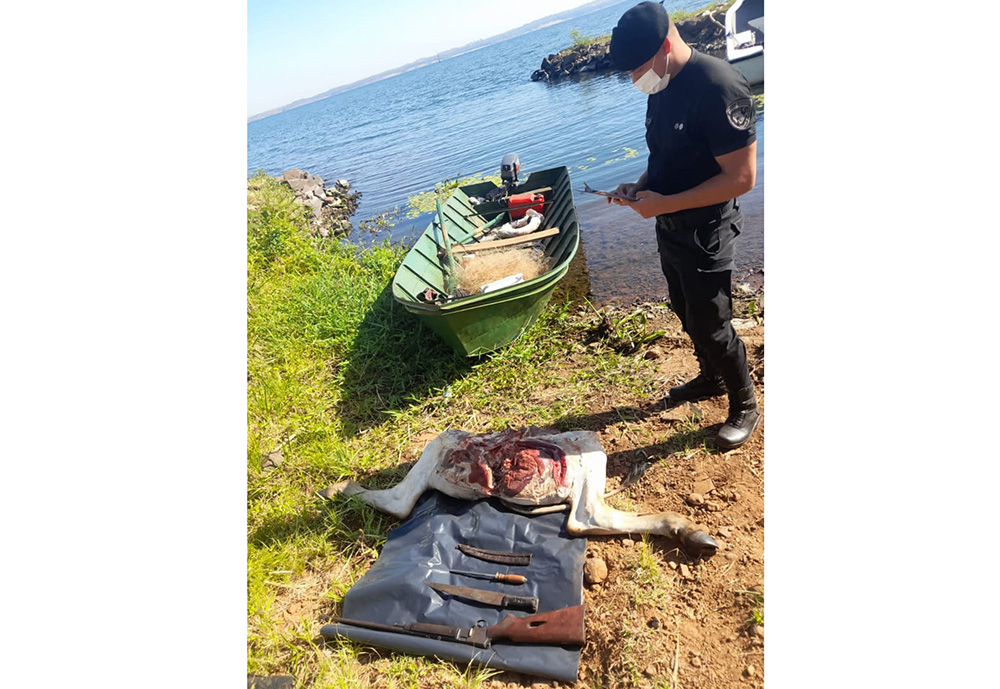 Integrantes de la División Comando Radioeléctrico Oeste de Posadas, junto a efectivos de la comisaría 19ª, detuvieron esta mañana a tres hombres de 24, 33 y 34 años quienes se trasladaban en una embarcación de madera propulsada a motor y que tenían en su poder un rifle calibre 22 mm, cuchillos, redes de pesca y dos cuartos de vaca de unos 30 kilogramos aproximadamente.
