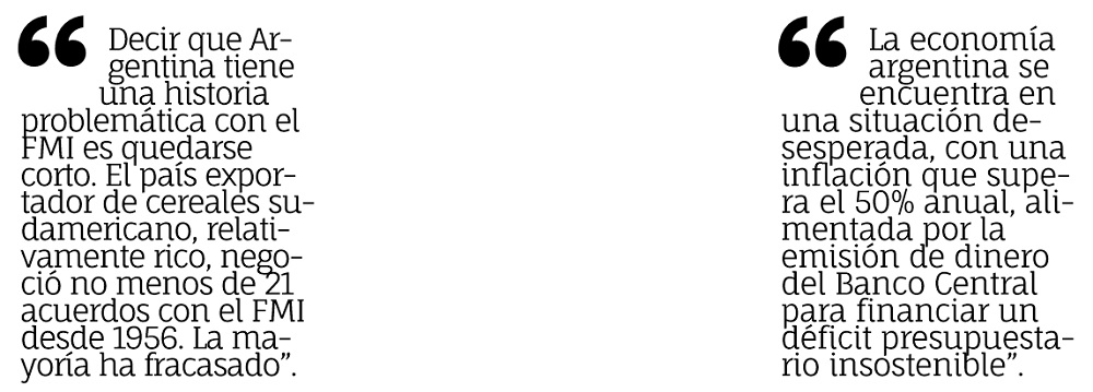 “Decir que Argentina tiene una historia problemática con el FMI es quedarse corto. El país exportador de cereales sudamericano, relativamente rico, ha negociado no menos de 21 acuerdos con el FMI desde su ingreso en 1956. La mayoría han fracasado”, indicó el FT en un editorial que se publicó ayer.