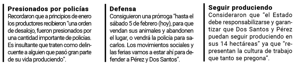 En relación a las expectativas sobre el desenlace al que puede arribar la situación, dijo: “Esperamos que el Gobierno provincial ayude a solucionar esto. Nosotros vamos a defender a los productores, que ya casi fueron desalojados el 6 de enero, les dieron tiempo hasta el sábado 5 de febrero, como fecha fija, para que vendan sus animales y abandonen el lugar, y si no abandonan el lugar vendrá la policía a actuar para sacarlos. Todos los movimientos sociales y las ferias francas vamos a estar ahí para defender a Pérez y Dos Santos. No vamos a dejar que sean desalojados”.
