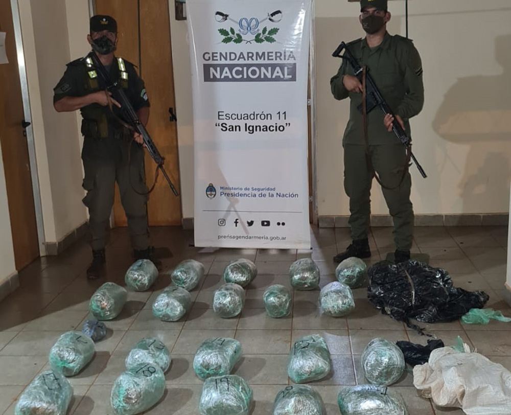Efectivos de Gendarmería Nacional de la Sección “Jardín América” se encontraban anoche realizando tareas de patrullaje sobre una zona montuosa cercana al río Paraná, cuando divisaron a un hombre que se desplazaba a pie desde la costa cargando dos bultos de grandes dimensiones sobre sus hombros.
