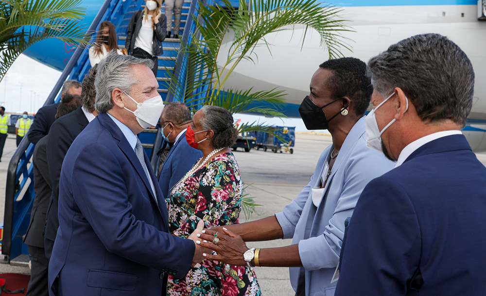 En su primera actividad oficial como flamante titular de la Comunidad de Estados Latinoamericanos y Caribeños (CELAC), el presidente Alberto Fernández mantuvo una reunión bilateral con la primera ministra de Barbados, Mia Mottley. Luego asistieron de una mesa de trabajo regional con la Organización de Estados del Caribe Oriental (OECO), integrada por seis países: Antigua y Barbuda, Dominica, Granada, Saint Kitts y Nevis, Santa Lucía y San Vicente y las Granadinas.