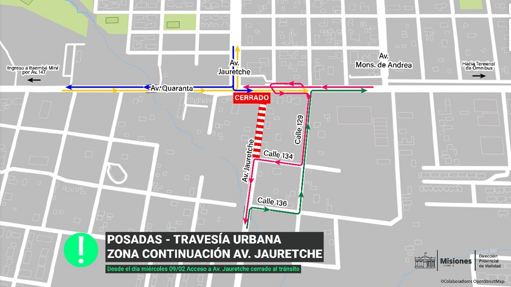 Esas alternativas se incorporan a las ya existentes, con las que los usuarios de Jauretche en sentido Itaembé Miní hacia Quaranta, podrán circular por la Av. Jauretche hasta el desvío por calle 136 y calle 129, o bien tomar avenida 147. Mientras que para el ingreso hacia el sur desde Quaranta podrán circular hasta la avenida 147 como vía rápida.
