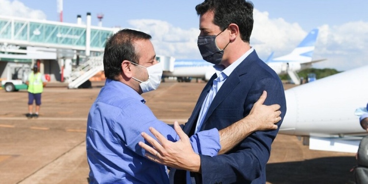 El ministro del Interior, Wado de Pedro, arribó en la tarde de este jueves al aeropuerto internacional de Puerto Iguazú, donde fue recibido por el gobernador de Misiones, Oscar Herrara Ahuad. Junto al ministro descendieron el gobernador de Santiago del Estero y presidente Pro Témpore del Consejo Regional del Norte Grande, Gerardo Zamora.