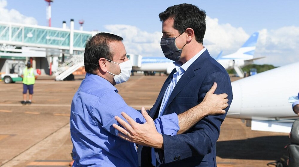 El ministro del Interior, Wado de Pedro, arribó en la tarde de este jueves al aeropuerto internacional de Puerto Iguazú, donde fue recibido por el gobernador de Misiones, Oscar Herrara Ahuad. Junto al ministro descendieron el gobernador de Santiago del Estero y presidente Pro Témpore del Consejo Regional del Norte Grande, Gerardo Zamora.