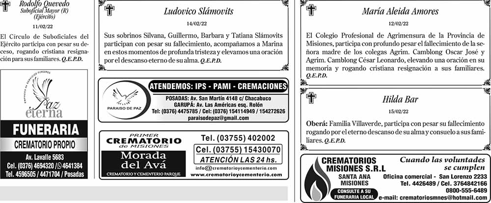 Fúnebres del Miércoles 16 de Febrero de 2022