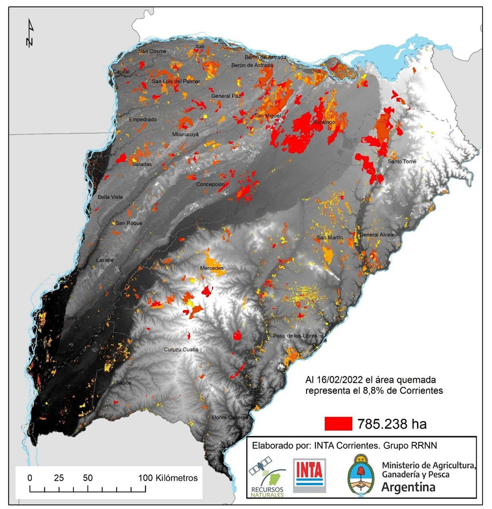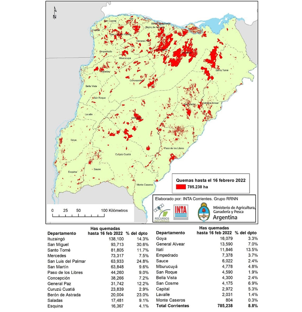 El grupo de Recursos Naturales de la Estación Experimental Agropecuaria Corrientes del INTA presentó un relevamiento de las áreas quemadas en la provincia de Corrientes, según coberturas vegetales. El mismo arrojó que al 16 de febrero de 2022 se habían quemado 785.238 hectáreas, donde el ritmo de progresión del fuego de los 9 días (entre el 7 y el 16 de febrero) fue de casi 30 mil ha diarias. De esta manera, el 9 % de la superficie del territorio provincial fue alcanzado por el fuego.
