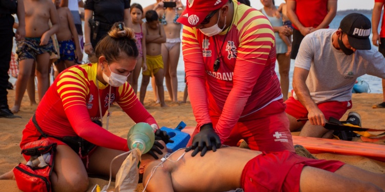 Desde el inicio de la práctica hasta el momento del “rescate” se contaron cuatro minutos, donde se realizó una reanimación cardiopulmonar y la aplicación de un desfibrilador en la orilla para asegurar la vida del bañista que se había ahogado, según lo indicaron los socorristas.