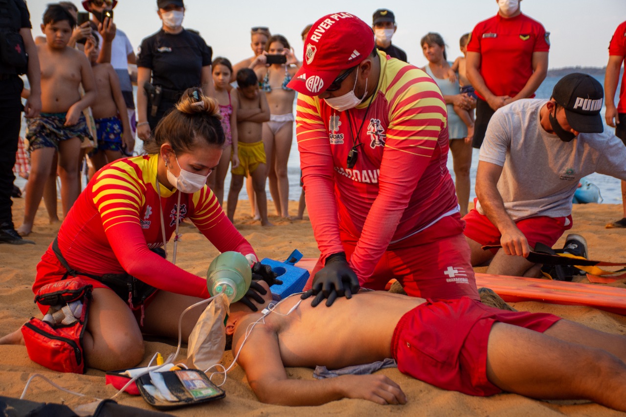 El simulacro comenzó cuando una persona ingresó al agua, hizo gestos con los brazos extendidos que alertaban un problema. Ahí se activó la alarma y empezó el plan de rescate, un socorrista que observaba el río desde una torre le indicó a su compañero que estaba en la arena que corra rápidamente hacia el agua y salve al bañista.