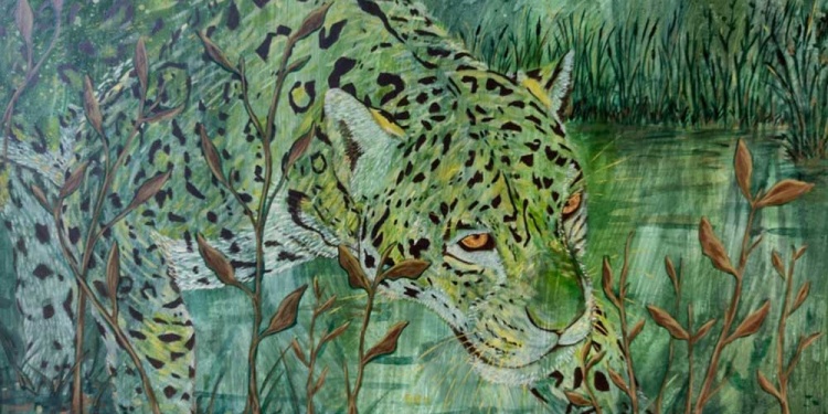 Un carpincho asoma su cabeza en medio de un esplendorosa y colorida postal, en la obra bautizada “El protagonista”, de la joven correntina María Luz Flores, artista, hija de artesanos, que se dedica en sus obras a pintar no solo los paisajes que la rodean, sino también aquellas especies en peligro de extinción y el esfuerzo que realizan por su protección y reinserción en su hábitat natural.