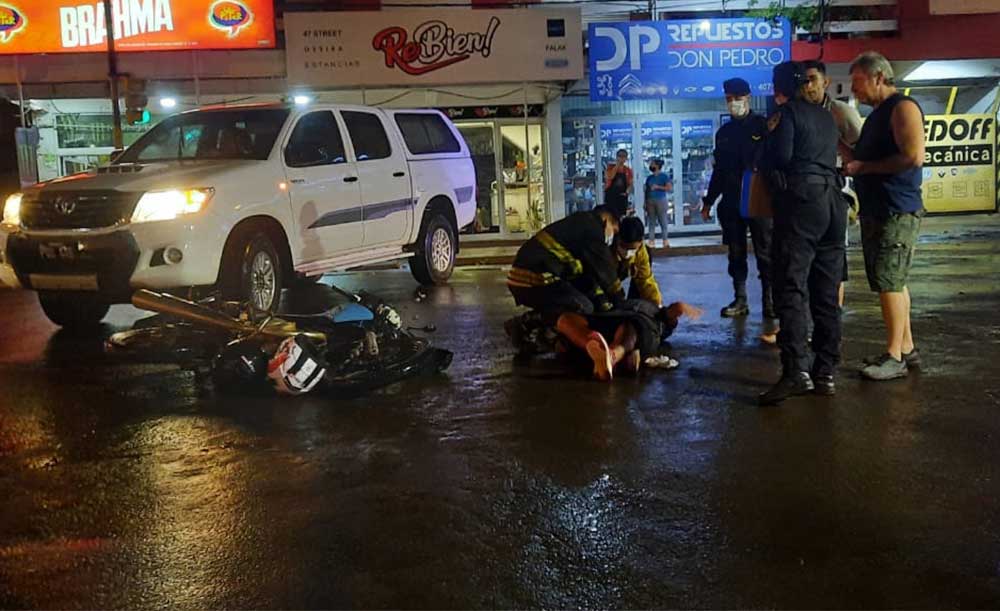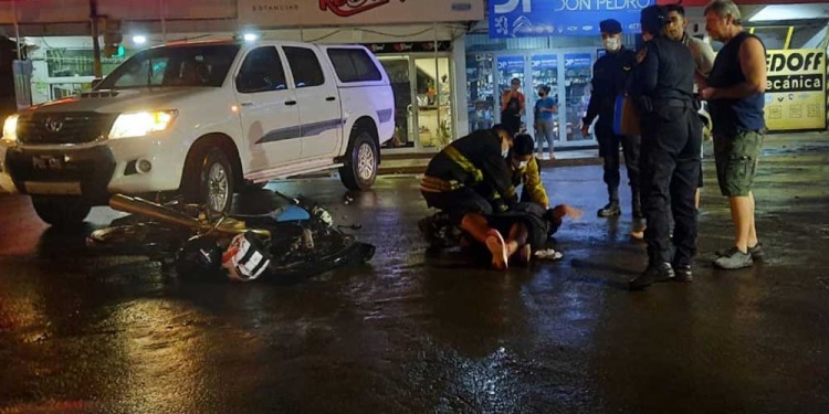 El hecho se dio este lunes por la noche entre la avenida Libertad y calle Río Negro de la Capital del Monte. Allí, un vehículo Toyota Hilux, conducido por un hombre de 52 años y acompañado por su esposa de 51, colisionó con una motocicleta Honda Titán, conducida por un joven de 22 años, quien tenía como copiloto a su concubina, según el parte policial.