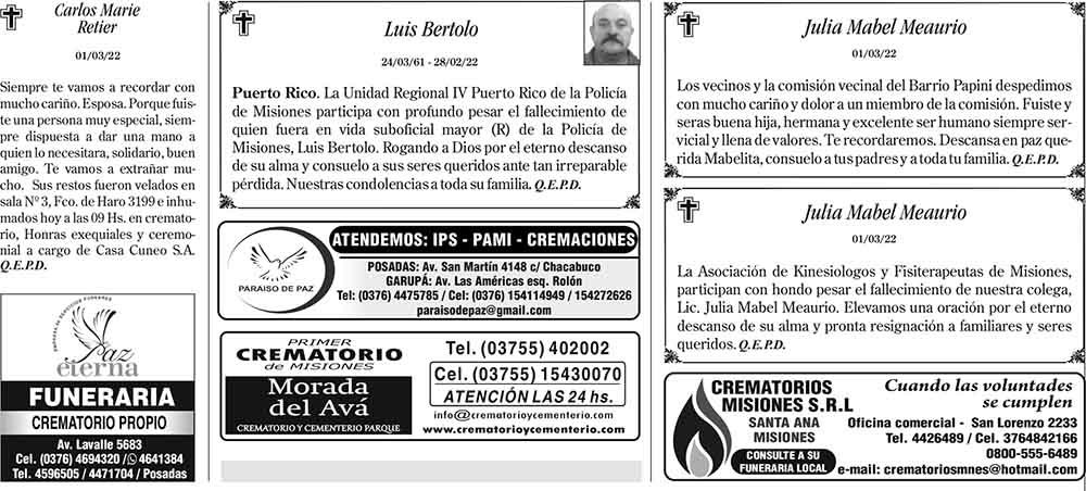 Fúnebres del Miércoles 2 de Marzo de 2022