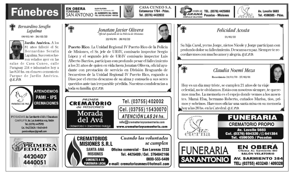 Fúnebres del domingo 27 de febrero de 2022