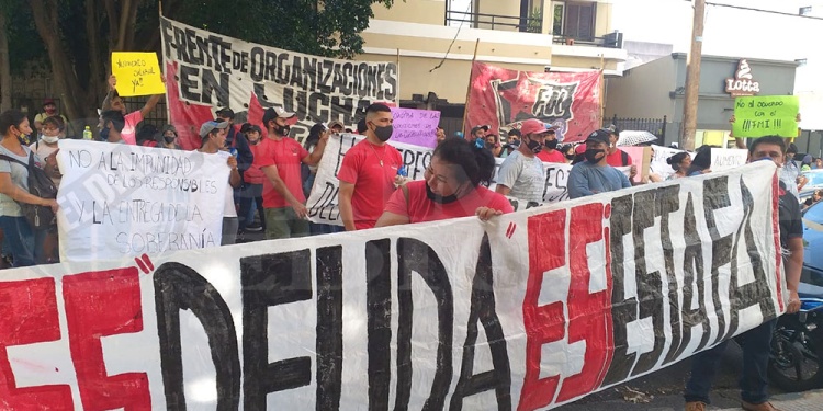 Los manifestantes agregaron que “mientras el 40% del país somos pobres, mientras la inflación supera el 50%, mientras la canasta básica total supera los $78.600, nosotros y nosotras decimos que no se debe pagar ni un solo peso a esta deuda fraudulenta, contraída por el gobierno de Mauricio Macri, y que solo sirvió para enriquecer a empresarios y bancos mediante el mecanismo de la fuga”.
