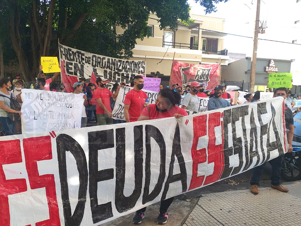 Los manifestantes agregaron que “mientras el 40% del país somos pobres, mientras la inflación supera el 50%, mientras la canasta básica total supera los $78.600, nosotros y nosotras decimos que no se debe pagar ni un solo peso a esta deuda fraudulenta, contraída por el gobierno de Mauricio Macri, y que solo sirvió para enriquecer a empresarios y bancos mediante el mecanismo de la fuga”.