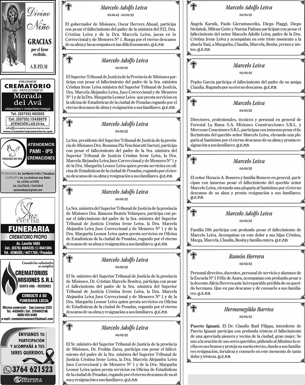 Fúnebres del sábado 5 de marzo de 2022