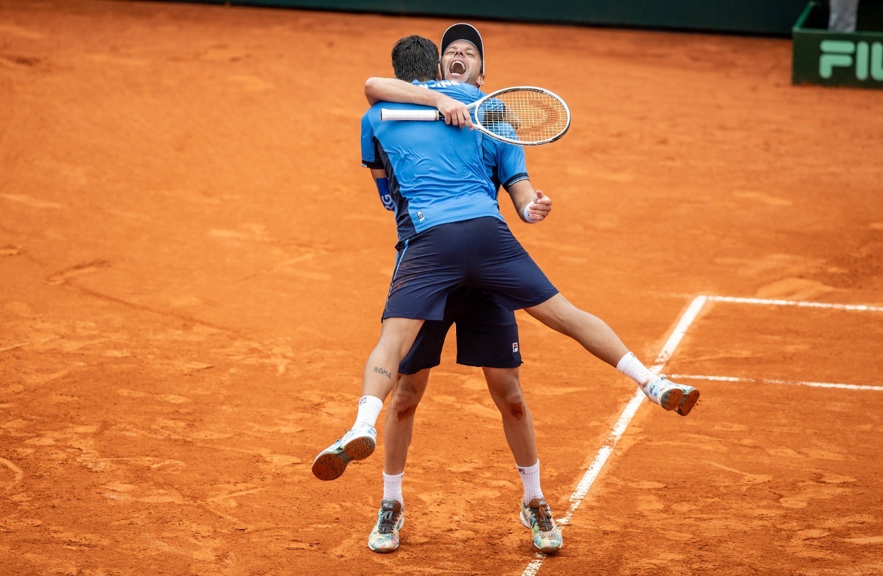 EL PUNTO GANADOR. Zeballos y González celebran el punto que devolvió a la Argentina a la elite de la Copa Davis.