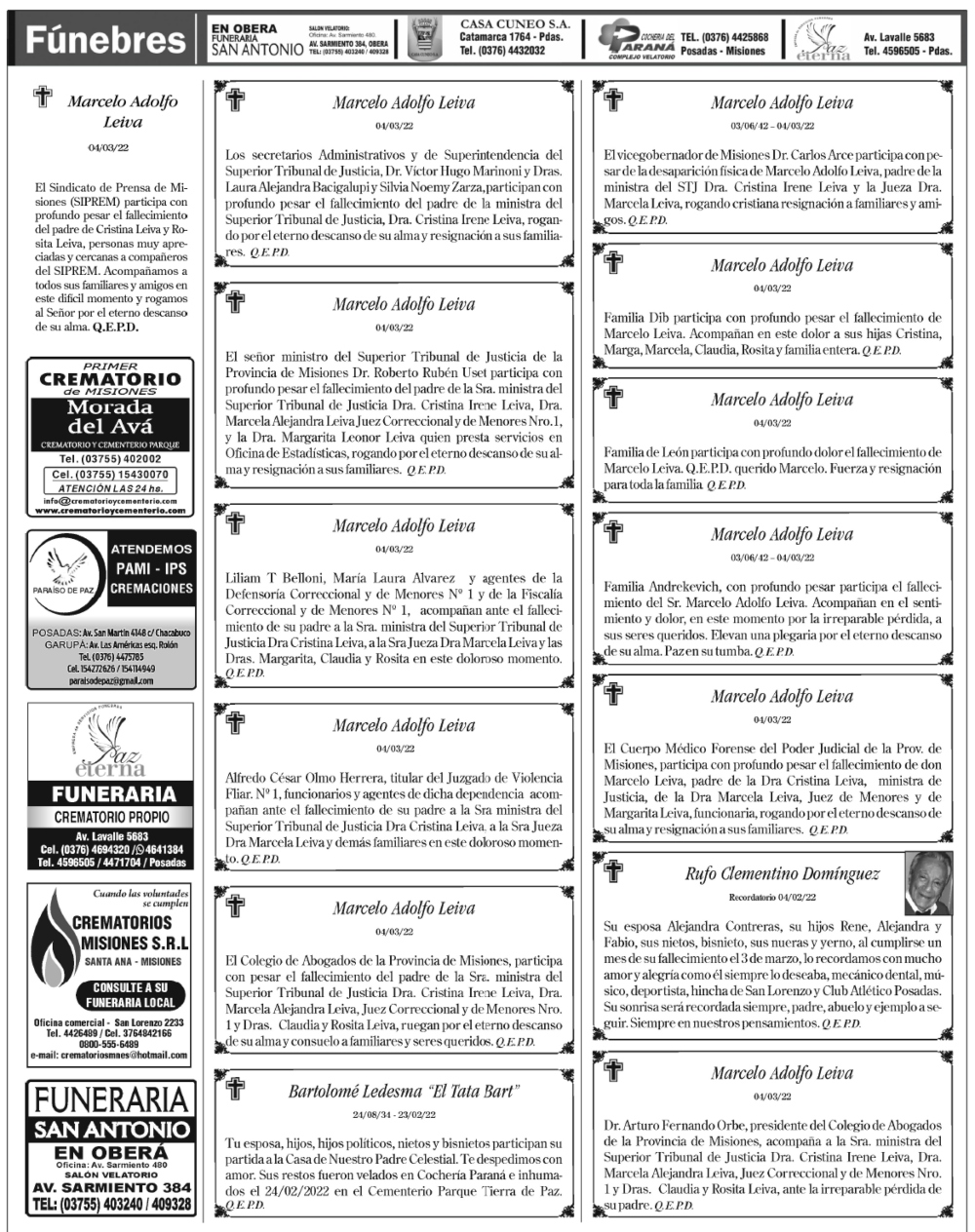Fúnebres del domingo 6 de marzo de 2022