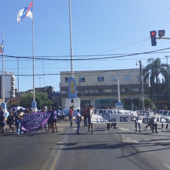 Docentes autoconvocados de Aristóbulo del Valle y Salto Encantado se encuentran reunidos en asamblea en la plazoleta de la Feria Franca de esta localidad, sobre la avenida 8 de septiembre, acompañando la medida de fuerza provincial que se lleva a cabo en el peaje de Santa Ana.