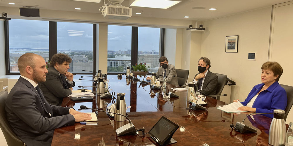 CARA A CARA. Martín Guzmán y Kristalina Georgieva en Washington en octubre pasado durante el proceso de renegociación del programa stand by firmado en 2018 por la administración de Mauricio Macri.