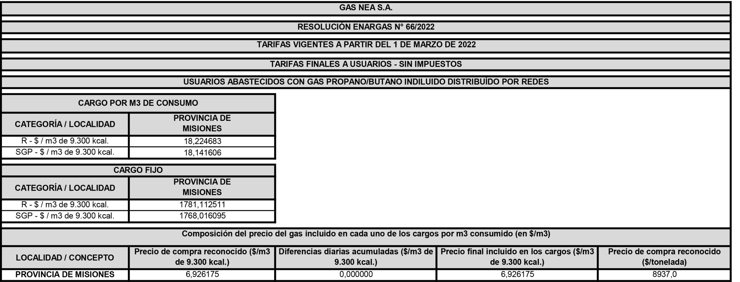 Cuadros tarifarios de Gas NEA SA