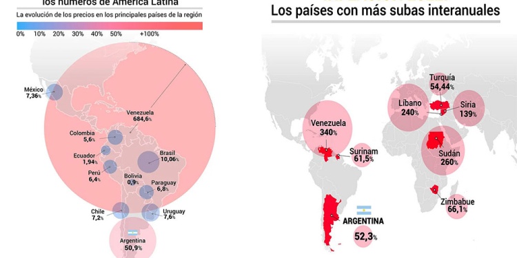 Los países que superaron a la Argentina el año pasado fueron Venezuela, con un 2.700% según el FMI (aunque las cifras oficiales de país arrojaron 686,4%, una desaceleración con respecto al casi 3000% de 2021); Sudán, con 194,6%; Zimbabue, con 92,5%; y Surinam, que registró un 54,4%. Se trata de naciones que atraviesan escenarios de conflictos bélicos, dictaduras y duras crisis internas.