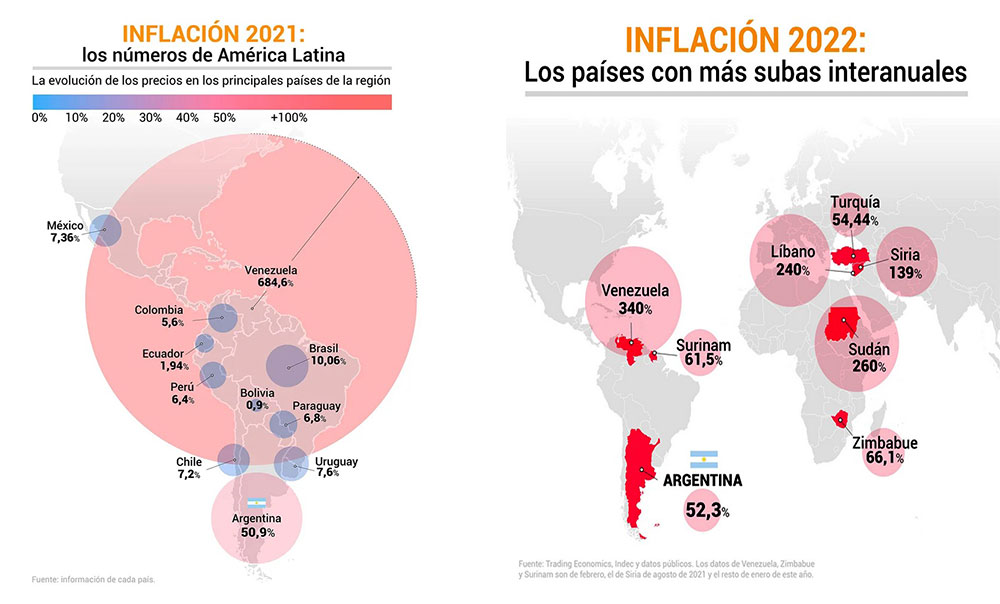 Los países que superaron a la Argentina el año pasado fueron Venezuela, con un 2.700% según el FMI (aunque las cifras oficiales de país arrojaron 686,4%, una desaceleración con respecto al casi 3000% de 2021); Sudán, con 194,6%; Zimbabue, con 92,5%; y Surinam, que registró un 54,4%. Se trata de naciones que atraviesan escenarios de conflictos bélicos, dictaduras y duras crisis internas.