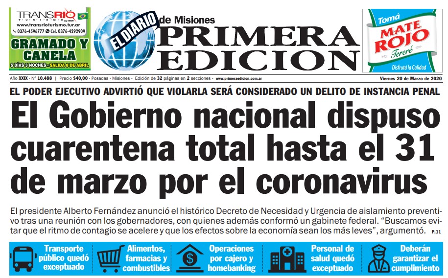 “Por el decreto, todos los argentinos y todas las argentinas, deberán someterse al aislamiento social preventivo y obligatorio. Esto quiere decir que a partir de este momento nadie debe salir de sus residencias, todos deben quedarse en sus casas”, indicó el mandatario en su discurso transmitido por cadena nacional.