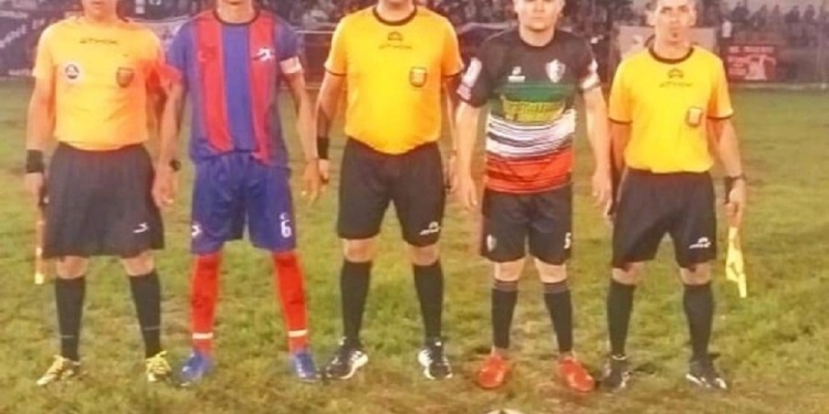 PARA LA FOTO. Los capitanes de Deportivo Vicov y Unión Cultural y Deportiva Eldorado juntos a la terna arbitral en la primera final.