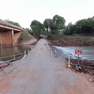 Este puente sobre el arroyo Pindaytí había sufrido una fuerte “fisura” y las autoridades de Vialidad Provincial lo sacaron de uso. “Hace un año de la fisura del puente que ahora ya no está”, dijo el alcalde. La entidad vial provincial construyó un puente provisorio para dar paso a vehículos hasta diez mil kilos de peso total.