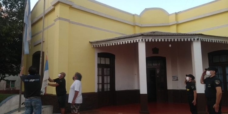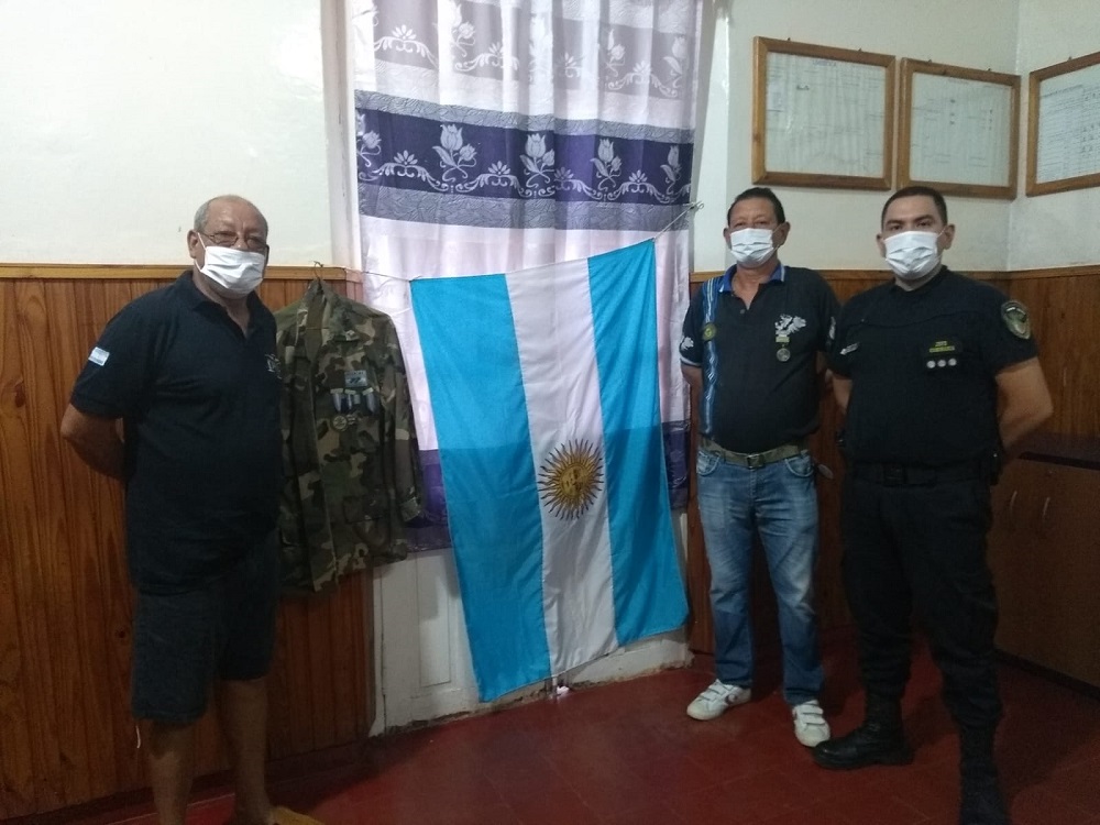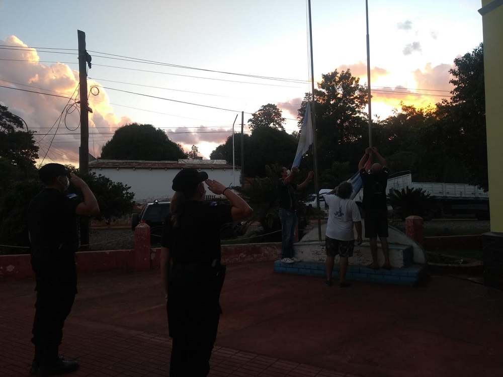 El arrío de los pabellones estuvo a cargo de los veteranos de la localidad, los cuales luego fueron entregados en conmemoración y estuvo a cargo del jefe de dicha Seccional policial.