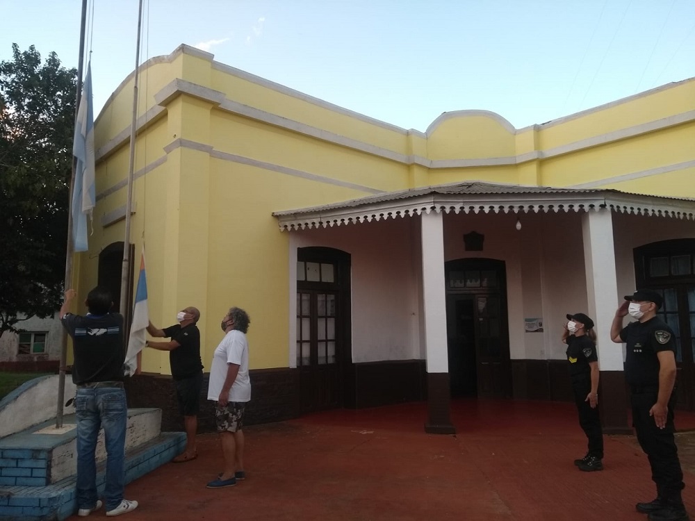 El arrío de los pabellones estuvo a cargo de los veteranos de la localidad, los cuales luego fueron entregados en conmemoración y estuvo a cargo del jefe de dicha Seccional policial.